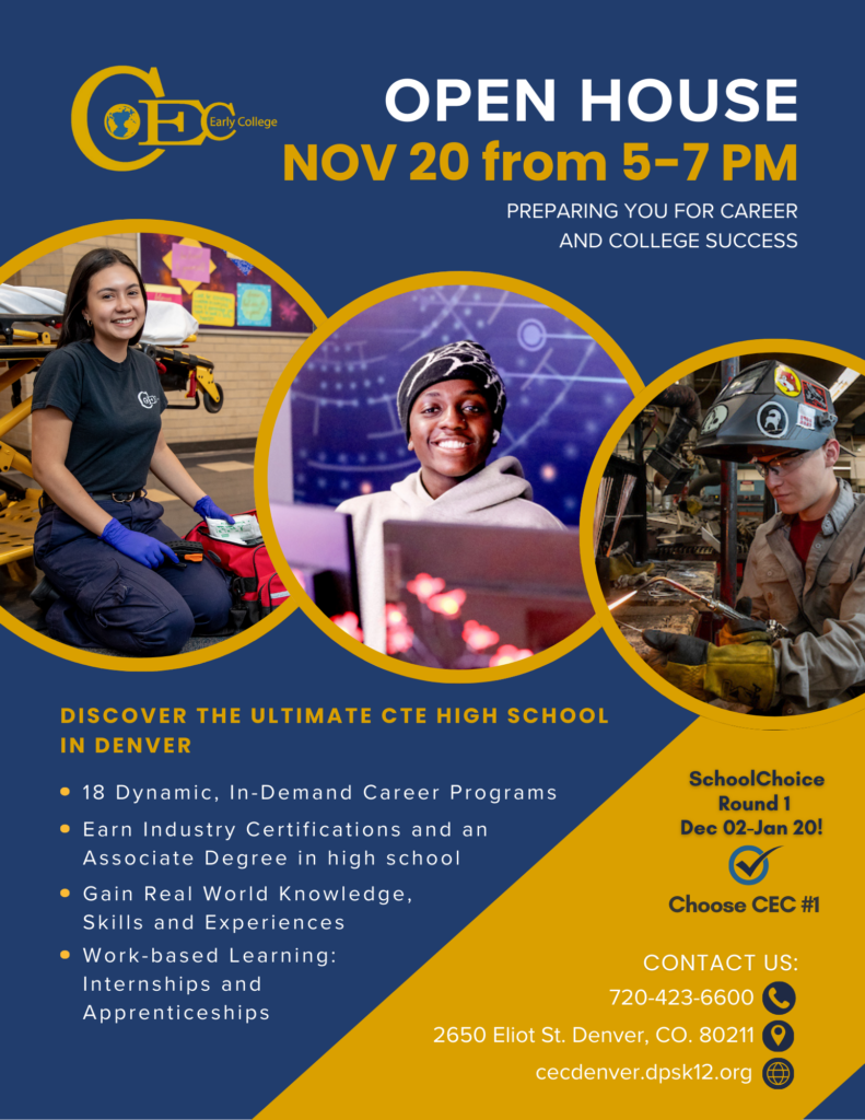 Our Open House is the best way to experience what CEC is all about. Meet our teachers, tour the campus, explore career pathways, and learn how students can earn free college, gain industry certifications and discover what you’re passionate about – all before high school graduation!